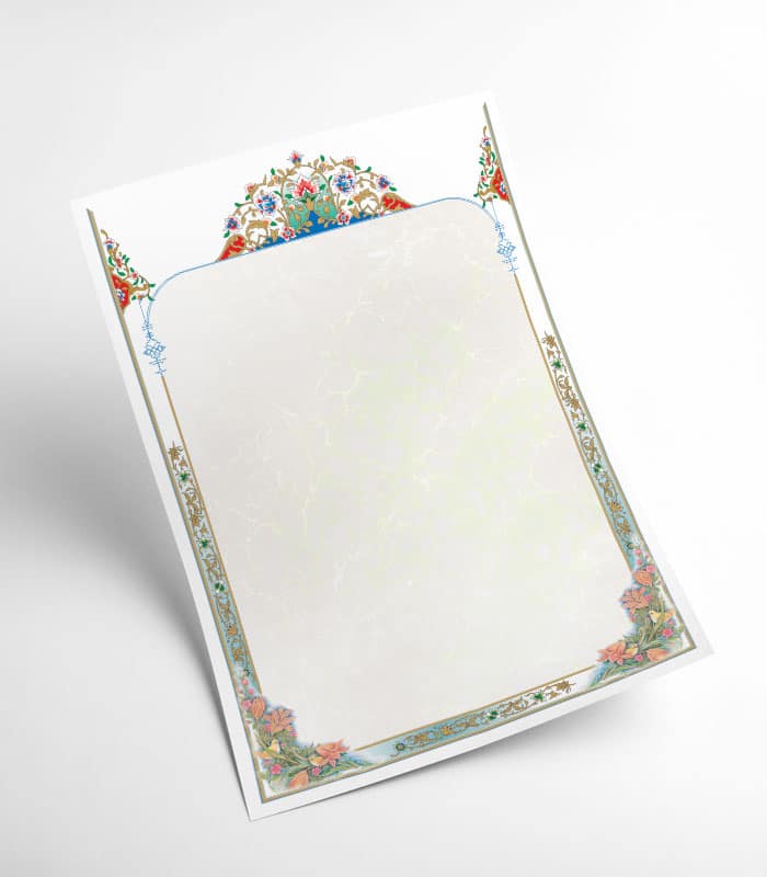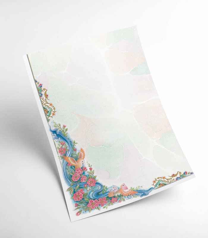 طرح ابروباد موجود روی این کاغذ، با هنر تذهیب ایرانی تلفیق شده و زیبایی بصری خاصی را به ارمغان آورده است.